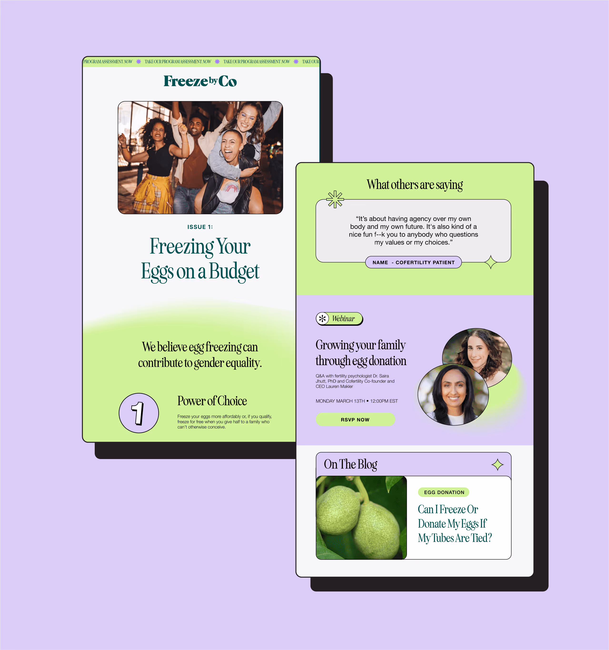 Freeze by Co’s mission is to make egg freezing more empowering, positive, and accessible — even free — when an egg donor gives half of the eggs retrieved to a family who can’t otherwise conceive. We departed from their old brand identity and revamped their color palette to create social media templates and emails that better resonated with their core audience.