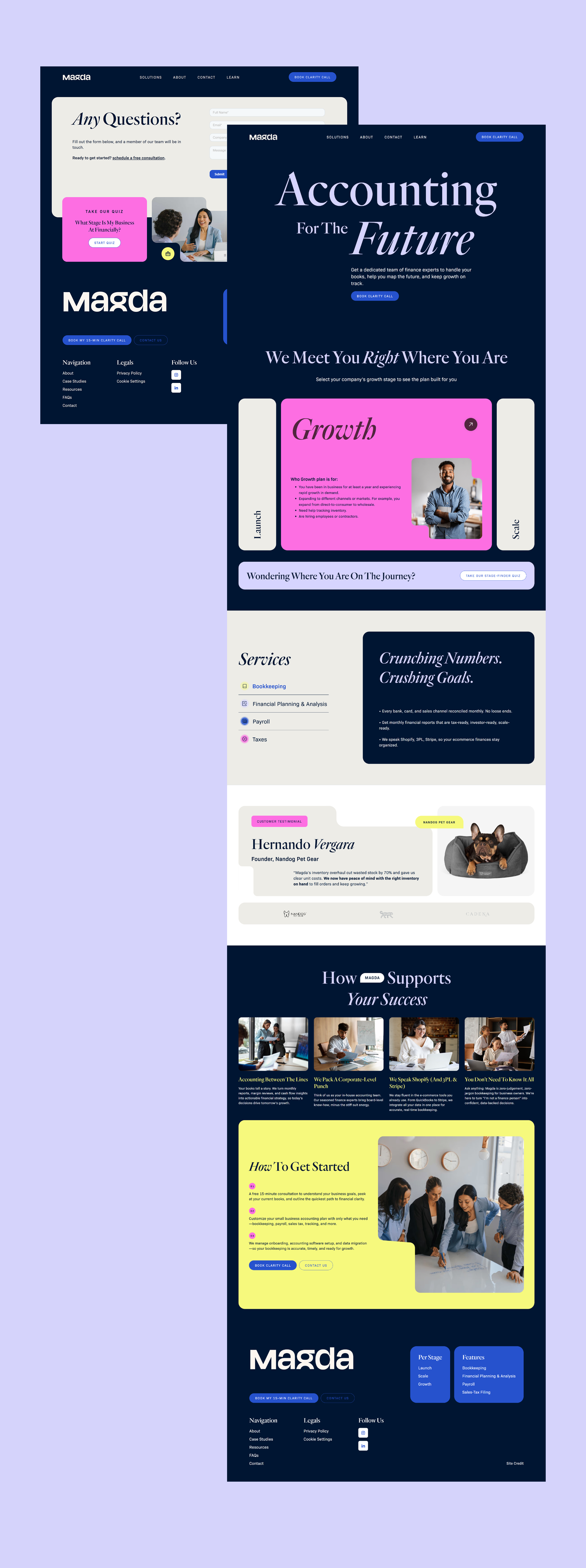 Magda was built on the belief that entrepreneurship is never a solo journey. We partnered with founder Vanessa Durán to develop the name, brand identity, website, and a full suite of brand assets that reflect Magda’s mission: combining the strategic insight of corporate finance with the bold energy of early-stage founders. The result is a brand that feels both intelligent and approachable, positioning Magda as a trusted financial partner for founders building their businesses with clarity, confidence, and ambition.